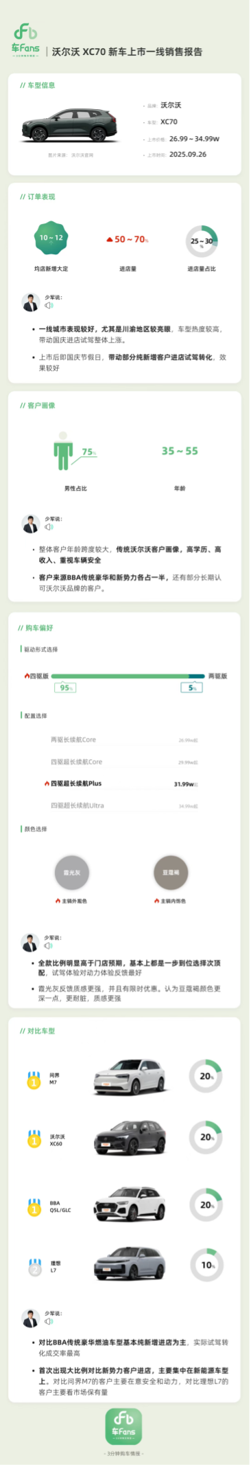 10月15日,沃尔沃汽车全新XC70上市销售快报显示,XC70全国均店新增大定8-12台,用户进店量同比激增50%-70%,充分印证其市场号召力与品牌信任度。