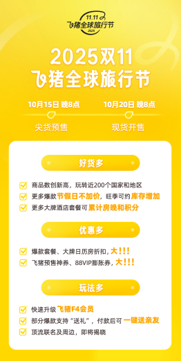 10月15日,2025年双11全球旅行节正式启动。飞猪透露,尖货预售于15日晚8点开始,全量现货销售将于20日晚8点开始。据透露,报名参加双11的商品数已连续5年增加,今年再创新高,更有不少旅行大牌首次携爆款加盟。