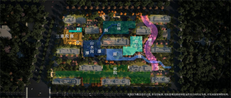 基于这样的地块禀赋,项目在整体规划上选择了与众不同的路径——以“园”为核心的规划骨相。