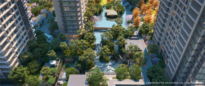 项目以“背山面水”为骨架,将约4.5万㎡园林打造成一座微缩的“自然博物馆”,既有宏阔格局,又不失精微巧思。处处皆景,步步生趣,让居者在移步换景间尽享四时之美,收获园林与生活交融的美好体验。