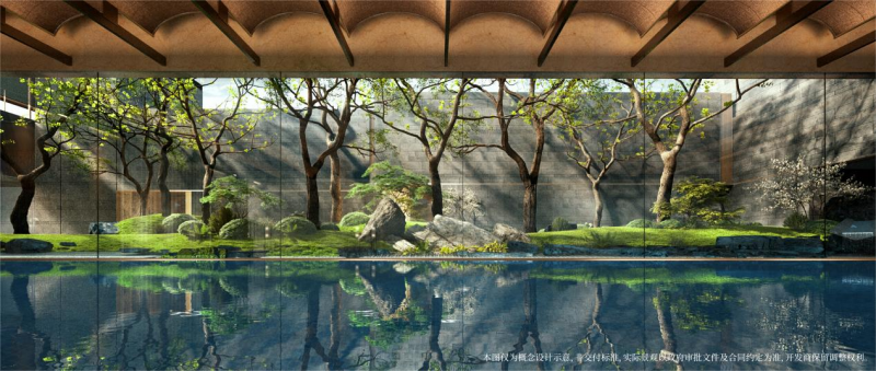 此外,约5700㎡的“宸雅会”会所也被整体纳入园境之中。无论是瀑布飞流、空山静谧,还是幽涧清朗,不同功能空间都与景致一一对应,实现“一窗一景一境”的沉浸体验:从泳池望去,可见葱郁林木与水面倒影交织,仿佛置身于山水画中;在健身房锻炼,窗外则是层峦叠嶂的“落翠”的生机气息;瑜伽室临窗而坐,环绕的是幽静的“空山”……每一次起身或转身,都是一段独特的园林旅程,让自然成为日常生活的背景与伙伴。