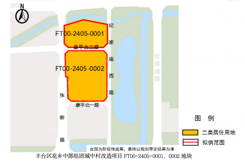 丰台区花乡中部组团城中村改造项目FT00-2405-0001、0002地块,位于丰台区玉泉营街道,三环至四环之间,邻近地铁房山线花乡东桥站、地铁10号线与房山线换乘首经贸站。地块周边有首都医科大学附属北京天坛医院、北京口腔医院、天坛生活广场、花乡奥莱村、纪家庙公园,生活配套完善。