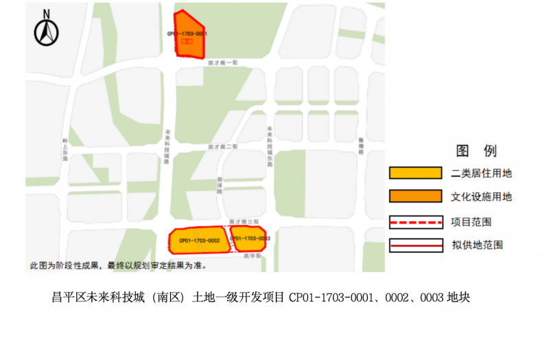 昌平区未来科技城(南区)土地一级开发项目CP01-1703-0001、0002、0003地块,位于昌平区北七家镇,五环至六环之间,邻近17号线未来科学城站。周边有北京王府中西医结合医院、未来科学城滨水公园、北京温榆河公园、北七家休闲公园等,生活配套完善。