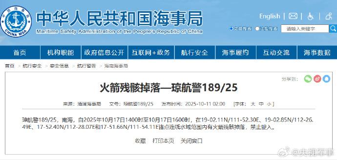 航行警告!今夜南海海域有火箭残骸掉落 请远离相关区域