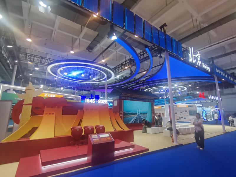 北京青年报记者步入北京展区时注意到,首先映入眼帘的便是庄重而富有感染力的“纪念中国人民抗日战争暨世界反法西斯战争胜利80周年”主题打卡装置。曾经于2025年9月3日纪念大会当天在天安门广场见证国家荣光的观礼席座椅被精心陈列于此,观众坐在座椅上感受阅兵式余温,打卡留念,用当下的光影向历史致敬。