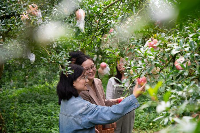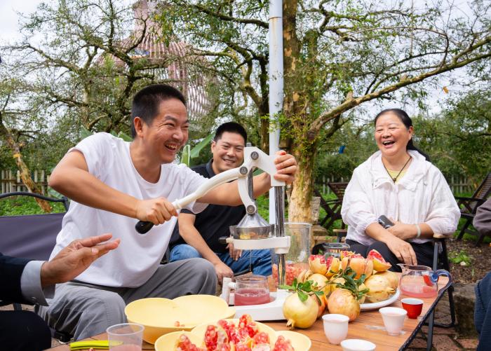 近年来,蒙自市持续推动石榴产业向精深加工领域拓展,大力发展农产品电商等配套产业、设立蒙自出口农产品综合服务中心,形成了从种植到销售的全产业链闭环。石榴产业正日益成为蒙自激活区域经济、带动群众增收的“黄金引擎”。10月16日,游客在蒙自百年古树石榴园品尝榨石榴汁。