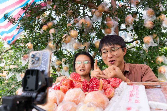 10月15日,返乡创业大学生吴海涛(右)和李敏在果园直播推介蒙自石榴。