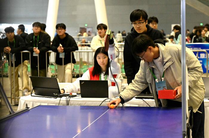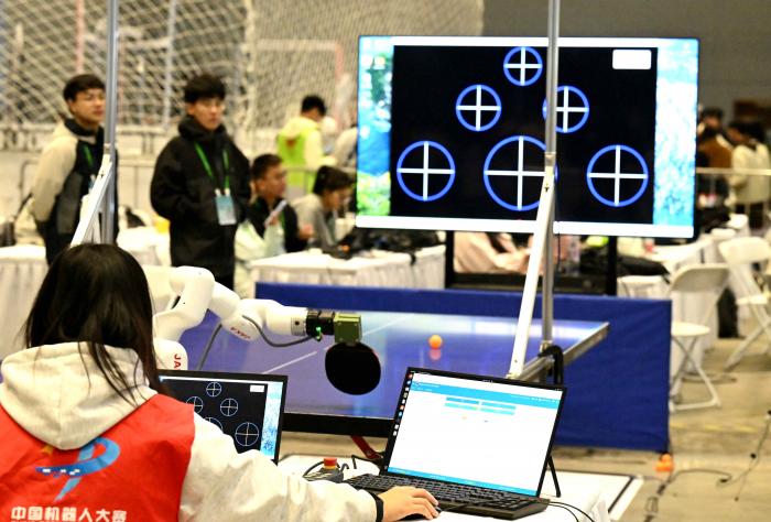 10月17日,乒乓球机器人在河北省石家庄国际会展中心进行比赛。新华社发(陈其保摄)