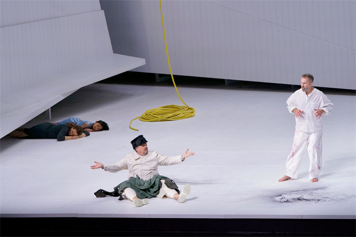 舞台上,导演约翰·西蒙斯打造了一个纯白色的极简空间。这并非单调,而是为了极致地服务于灯光与影像的调度,以流动的光影构建变幻的梦境。“这是我第四次导演《沃采克》,前三次是话剧版,而这次是首次导演歌剧版《沃采克》。”西蒙斯介绍说,这部歌剧的每一幕结尾处都会有儿童演员出现在舞台上,“儿童的主题对于整部剧的制作中是非常重要的,有着深刻的寓意。”
