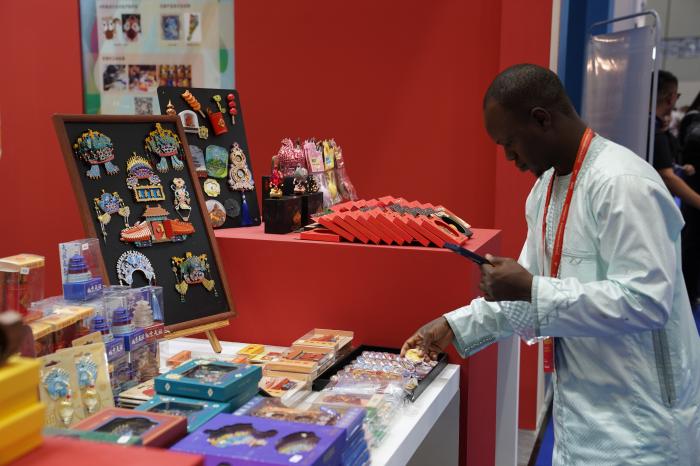 10月18日,参展商在陶瓷博览会展区观看文创产品。