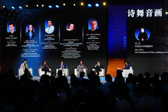 活动邀请来自西班牙、埃及、尼日利亚、新西兰、巴西、新加坡等国家的二十余位艺术家与文化学者,通过主题表演、文明对话、共创展演等多种形式,共绘文明互鉴画卷。10月18日,参加艺术雅集的嘉宾在对话环节。