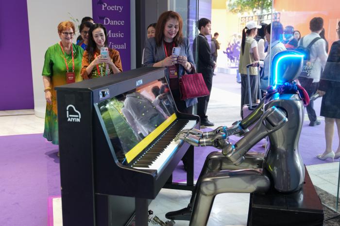 10月18日,受邀参加艺术雅集的艺术家、文化学者驻足观看机器人弹奏钢琴。