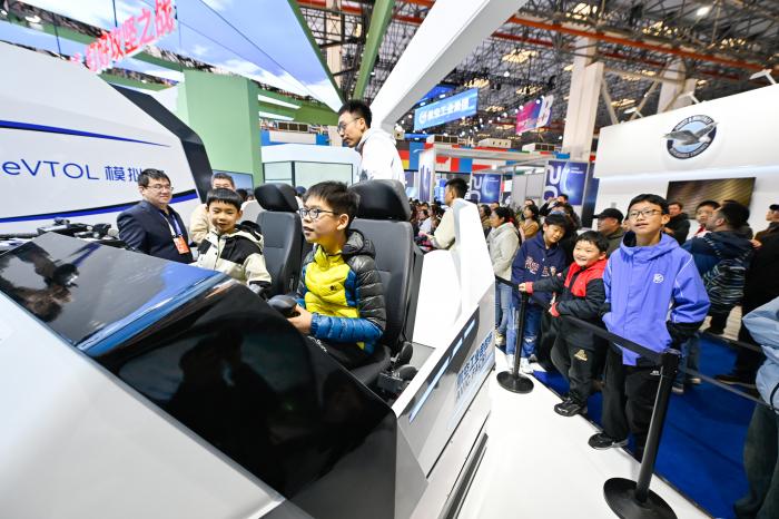 10月18日,在第七届中国天津国际直升机博览会上,孩子们体验直升机模拟飞行。新华社发(杜鹏辉摄)