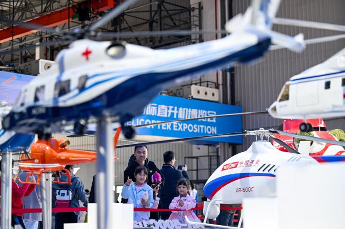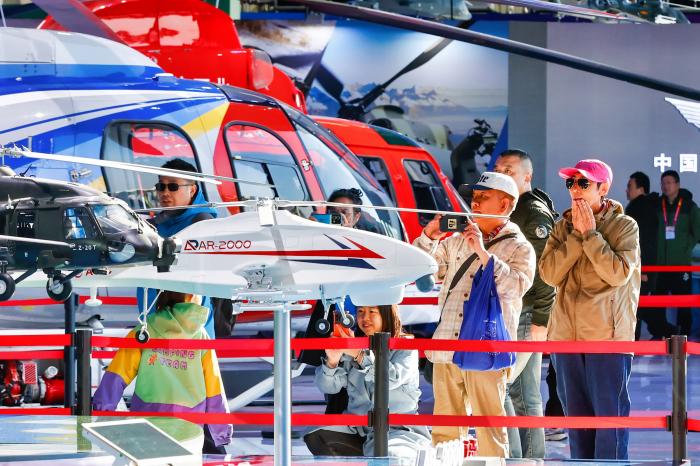 10月18日,在第七届中国天津国际直升机博览会上,观众在飞机模型前驻足观看。新华社发(杜鹏辉摄)
