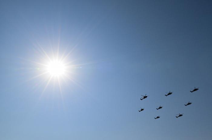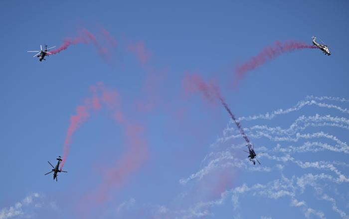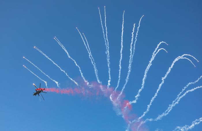 10月18日在第七届中国天津国际直升机博览会上拍摄的飞行表演。新华社发(杜鹏辉摄)