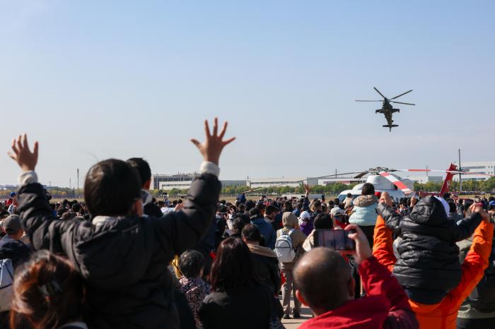 10月18日,观众向完成飞行表演的直-10直升机致意。新华社记者 孙凡越 摄