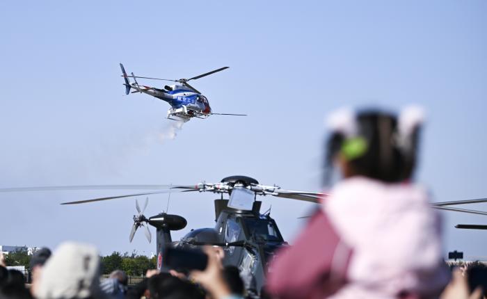 10月18日,在第七届中国天津国际直升机博览会上,参观者观看飞行表演。新华社发(杜鹏辉摄)