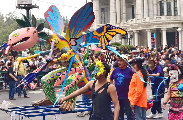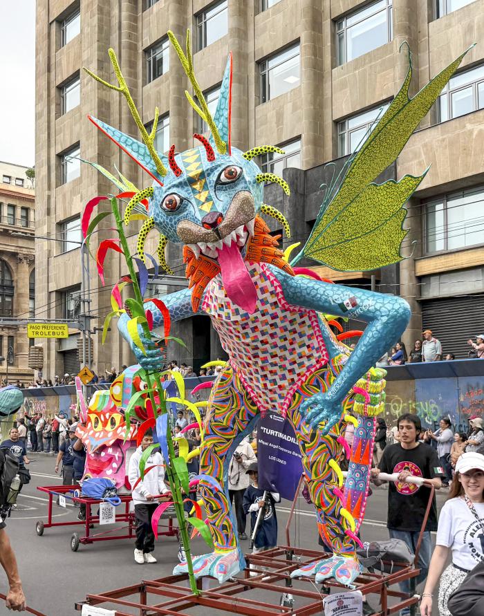 Alebrijes”是一种墨西哥传统手工艺品,用鲜艳的颜色和丰富的图案装饰,展现充满想象力的奇幻动物形象。这是10月18日在墨西哥首都墨西哥城拍摄的魔幻动物大游行现场(手机照片)。新华社记者 章磊 摄