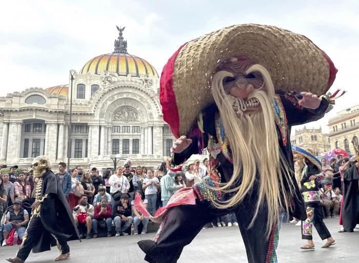 10月18日,在墨西哥首都墨西哥城,人们头戴传统面具载歌载舞参加魔幻动物大游行(手机照片)。新华社记者 武巍 摄