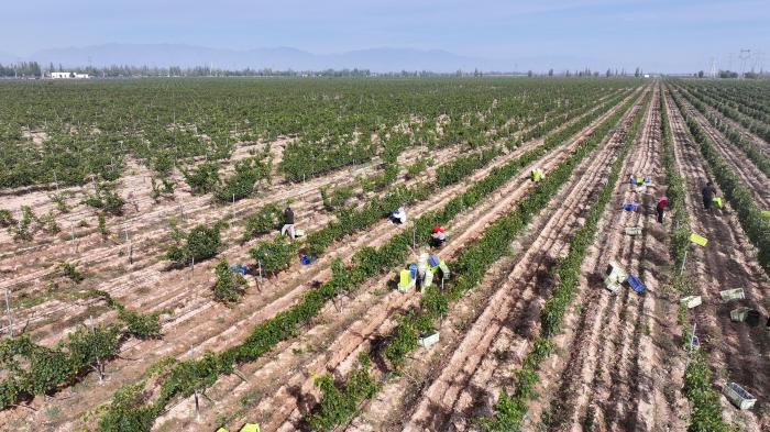 宁夏西海固曾有“苦瘠甲天下”之称,山大沟深、土地贫瘠。1996年,福建与宁夏确立对口帮扶关系。“吊庄移民”这一重大移民工程的实施,让西海固大山里的百姓搬迁到贺兰山东麓的未开垦之地。农户在银川市永宁县闽宁镇葡萄地里采摘酿酒葡萄(无人机照片,10月14日摄)。新华社记者 杨植森 摄