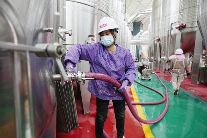 闽宁镇所在的宁夏贺兰山东麓葡萄酒产区位于北纬38度左右,是业界公认适合种植酿酒葡萄和生产高端葡萄酒的“黄金地带”之一。依托气候、资源优势,2021年,宁夏国家葡萄及葡萄酒产业开放发展综合试验区在闽宁镇挂牌。工作人员在银川市永宁县闽宁镇贺兰红酒庄酿酒车间工作(10月14日摄)。新华社记者 王鹏 摄