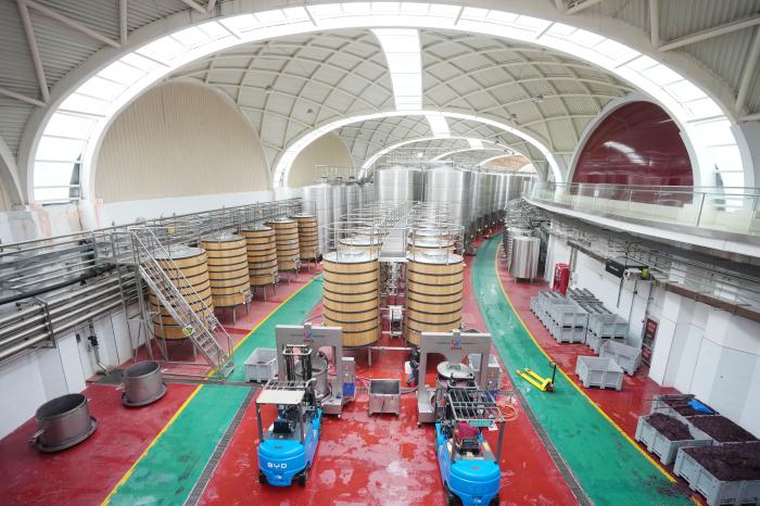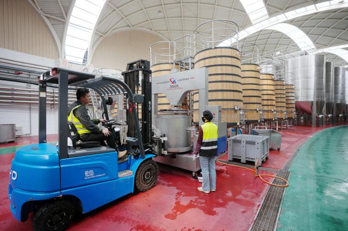 工作人员在银川市永宁县闽宁镇贺兰红酒庄酿酒车间工作(10月14日摄)。新华社记者 王鹏 摄