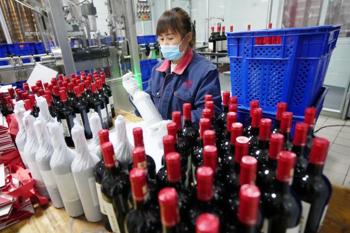 工作人员在银川市永宁县闽宁镇立兰酒庄包装葡萄酒(10月14日摄)。新华社记者 王鹏 摄