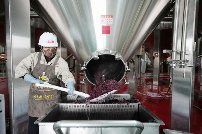 工作人员在银川市永宁县闽宁镇的贺兰红酒庄对酿酒葡萄进行压榨处理(10月14日摄)。新华社记者 杨植森 摄