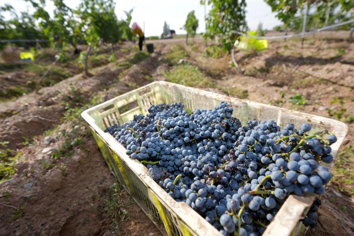 为了移民群众“稳得住、能致富”,闽宁镇因地制宜,大力发展葡萄酒产业,为这片不毛之地带来了绿色的发展生机。工作人员在银川市永宁县闽宁镇的贺兰红酒庄拣选酿酒葡萄(10月14日摄)。新华社记者 杨植森 摄
