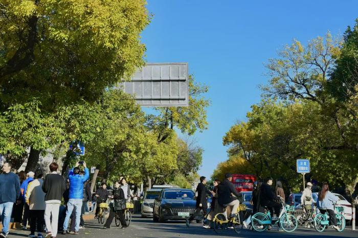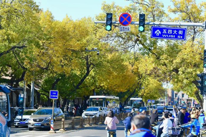 秋日的五四大街,白蜡树迎来了一年中最绚烂的时刻。满树金黄的叶片在微风中轻轻摇曳,与周边的历史建筑相映成趣,成为京城秋日里的一道独特风景线,吸引了众多市民前来拍照打卡。