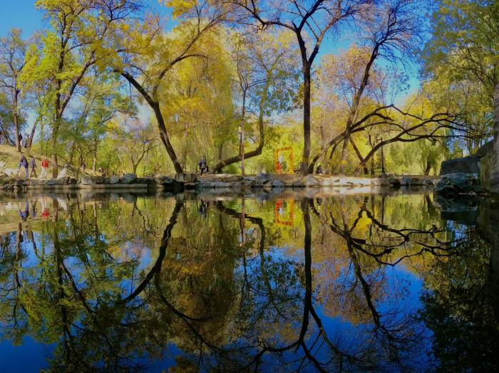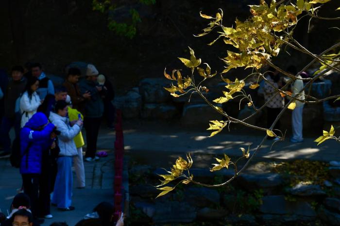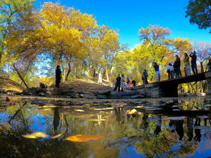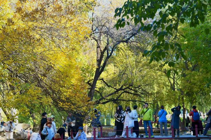 10月19日,圆明园苹香榭区域秋意盎然,金黄的树叶、澄澈的蓝天与静谧的湖水交相辉映,构成了一幅绝美的秋日画卷。