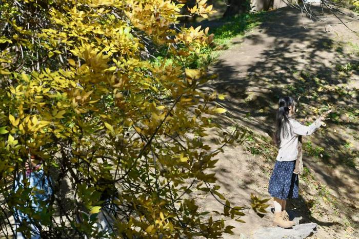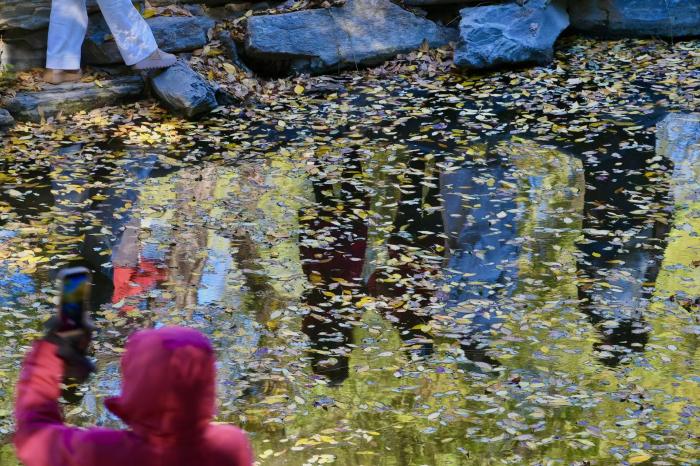 游人在湖边驻足,用镜头记录下这醉人的秋色。