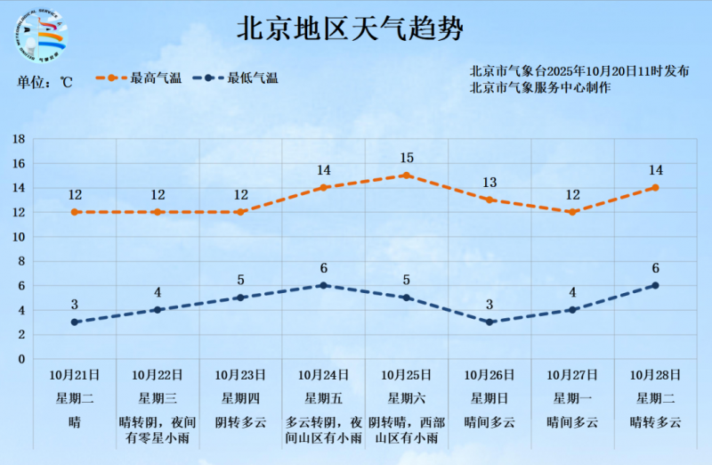 10月22日白天(周三):晴转多云;北转南风2、3级;平原地区最高气温12℃,山区最高气温7~11℃。