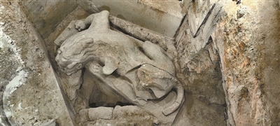 经过考古专家的清理和考证,这座镇水兽背部距现状地表深2.4—2.5米,探方最深处深3.1米。镇水兽身体整体大致呈西北东南向,方向135°。头似狮,朝向东南,下探视河道内的水面。身似虎,被挂鳞甲,局部有祥云纹,臀部及外侧腹部浑圆,四条腿紧抓在石板上,尾巴粗壮,同身体均向内侧弯曲。身长3米,宽1.2—1.4米,高0.48米。镇水兽外侧完好,内侧即靠近河道的一侧有残损,包括部分背脊、左前腿、左后腿及臀部。正阳桥位于城市中轴线上,居南、居中,是内城九门外规制最高的一座石桥,镇水兽作为正阳桥的附属遗存,其有如此体量,也与正阳桥的规制相呼应。此外,位于桥孔顶部、券脸正中由三块条石拼合组成的吸水兽,前身匍匐,脑袋探向河面,两只前爪强劲有力,紧紧抓住券脸,神态、形制清晰可见。