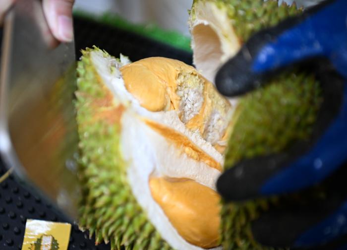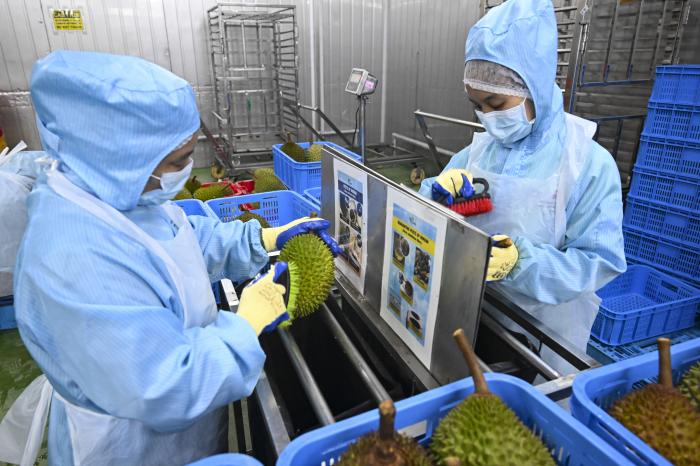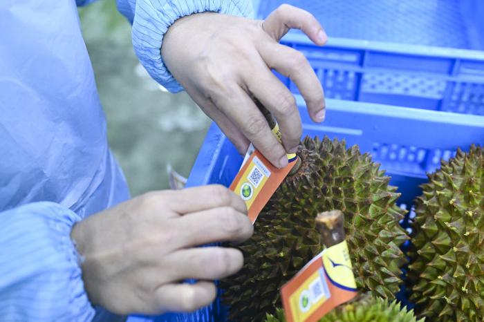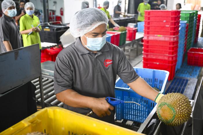 一颗颗来自马来西亚劳勿的榴莲,跨越山海、极速直达,成为连接中马饮食文化的甜蜜纽带。10月16日,在马来西亚雪兰莪州的一家榴莲加工厂,工作人员按果重将榴莲分级,每颗均贴上含“溯源码”的标签。新华社记者 程一恒 摄