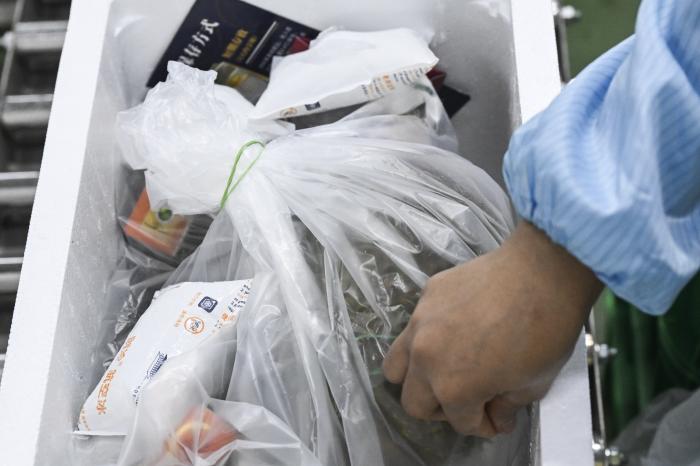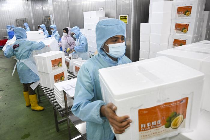 10月16日,在马来西亚雪兰莪州的一家榴莲加工厂,工作人员将分级后的榴莲放入定制泡沫箱,箱内铺设吸水纸与冰袋。新华社记者 程一恒 摄
