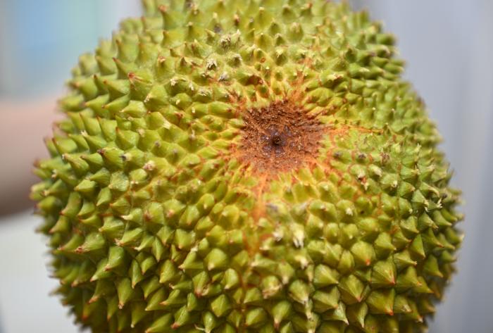 这是10月16日在马来西亚彭亨州劳勿拍摄的一颗成熟的猫山王榴莲,底部有“五角星”形状。新华社记者 程一恒 摄