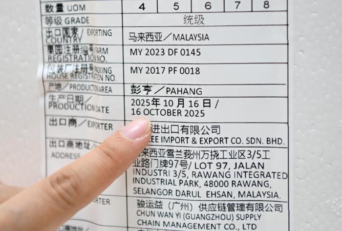 10月17日,在广州白云区一家水果经销商的运营中心,工作人员展示刚到货的榴莲鲜果标签。新华社记者 邓华 摄