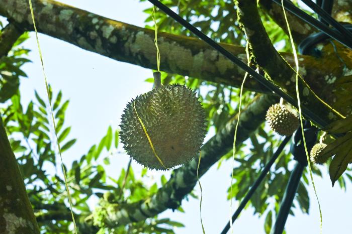 这是10月16日在马来西亚彭亨州劳勿拍摄的一颗成熟的猫山王榴莲。这里的榴莲遵循“瓜熟蒂落”原则,在树上自然完全成熟自行掉落。园丁会提前将一颗颗榴莲用绳绑住以防坠落损坏。新华社记者 程一恒 摄