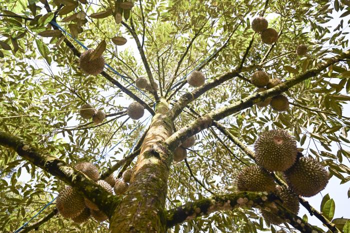 这是10月16日在马来西亚彭亨州劳勿拍摄的一棵榴莲树,树枝上挂满了沉甸甸的黑刺榴莲。新华社记者 程一恒 摄