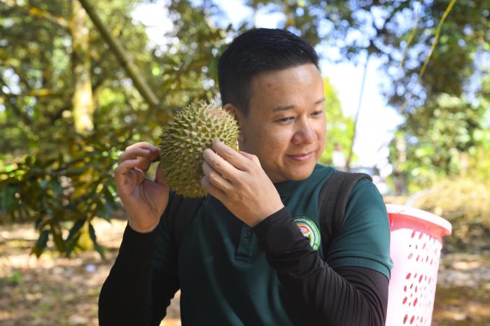 10月16日,在马来西亚彭亨州劳勿榴莲园,榴莲收购商张健豪将榴莲在耳边轻轻晃动,根据果肉震动的声音来判断榴莲成熟度。新华社记者 程一恒 摄