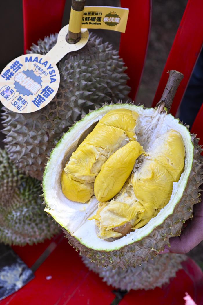 这是10月16日在马来西亚彭亨州劳勿拍摄的一颗打开的猫山王榴莲。新华社记者 程一恒 摄
