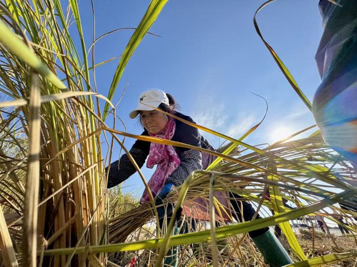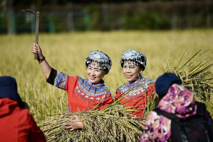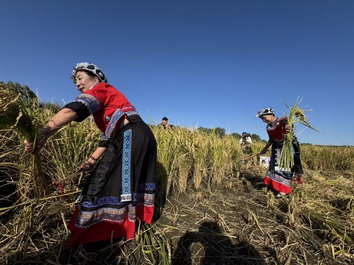 随着开镰仪式启动,村民们手持镰刀弯下腰,割下第一把稻穗,象征着五谷丰登、年年有余。