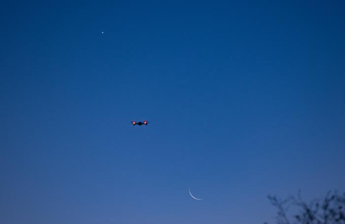 10月20日,在位于黑龙江省黑河市的北大荒集团北安分公司赵光农场有限公司,摄影爱好者在用无人机拍摄启明星伴月。