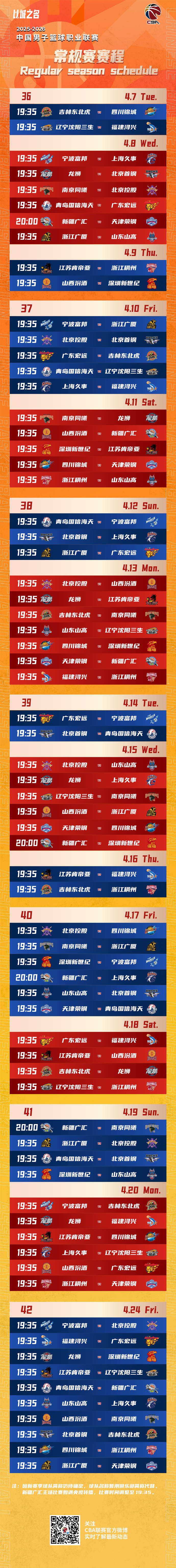 20日晚,CBA联赛公司对外公布了CBA2025-26赛季的赛程。由于今年有全运会比赛,因而新赛季CBA开始时间推迟到12月12日开始,揭幕战是卫冕冠军浙江广厦队与上赛季最大黑马山西队之间的交锋。北汽男篮、北控男篮的首场比赛都是在13日,北控对阵山东;北汽对阵江苏。