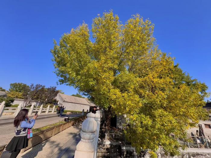 深秋的北京东不压桥胡同口,一棵高大的白蜡树枝头已铺满金黄,如撑开的巨型金伞般矗立在石桥旁,与古玉河遗址、青砖灰瓦相映成趣,每日吸引大批市民前来定格秋景。