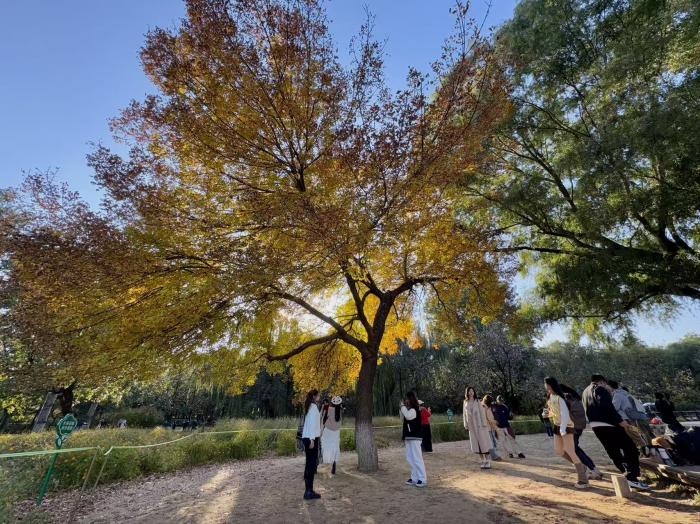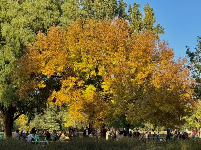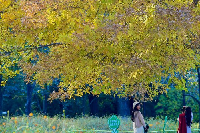10月21日,北京奥林匹克森林公园北园“花田野趣”景区内的一棵白蜡树意外走红,金黄树冠在花海中格外醒目,成为青年人赏秋打卡的“顶流地标”。