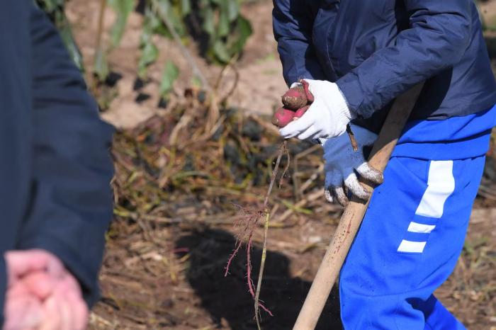 学生们挥动镐子进行收割,共同感受丰收之喜。