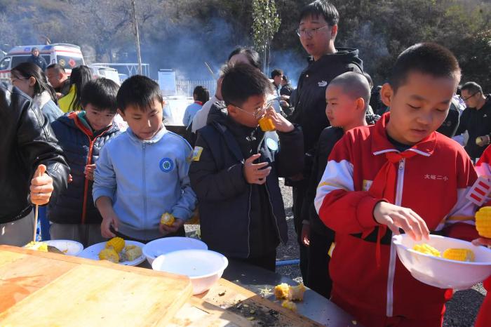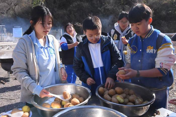 烹饪区内,炊烟袅袅,香气四溢,同学们刚刚采摘下来的红薯已经被清洗干净,放入大柴锅中,慢慢地,食物香气传来,吸引还在田中玩耍的同学们过来。