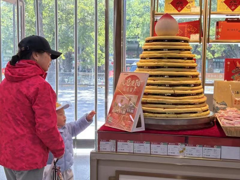 北青报记者在北京稻香村东城食尚店看到,店内摆放了一个近一米高的花糕塔,吸引了不少市民驻足观看并拍照留念。“这花糕塔真有老北京过节的味儿!”一位带着孙女的大爷笑着说。